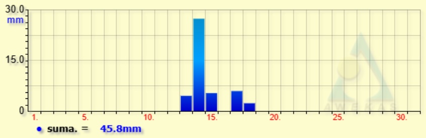 La pluviometria no molt quantiosa i tota concentrada al centre de mes. Especialment rellevant va ser la tarda del dia 14. En total quasi 46 litres/m2.